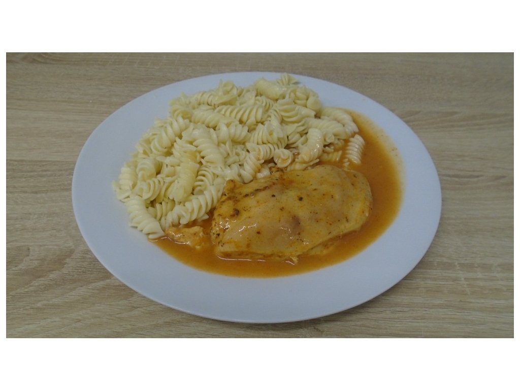 Složení: kuřecí prsní řízky, mouka, cibule, olej, mléko, smetana, bujon, paprika mletá, sůl, pepř, těstoviny.