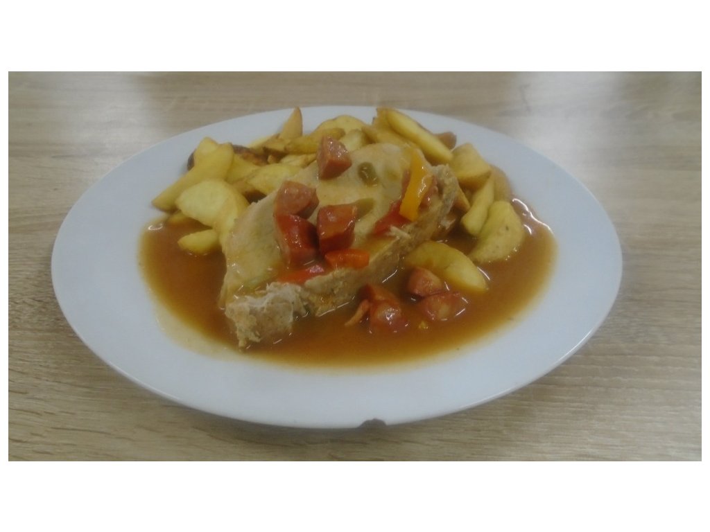 Složení: vepřová pečeně, cibule, klobása papriková, kečup, Davel uzený špek, mouka, olej, víno, bujon, sůl, pepř, americké brambory.