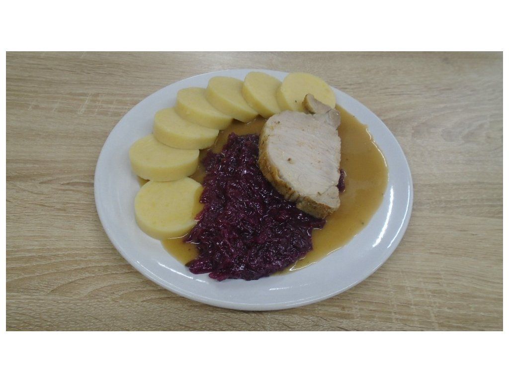 Složení: vepřová pečeně, mouka, cibule, olej, bujon, sůl, kmín, knedlík bramborový, zelí červené, cukr.